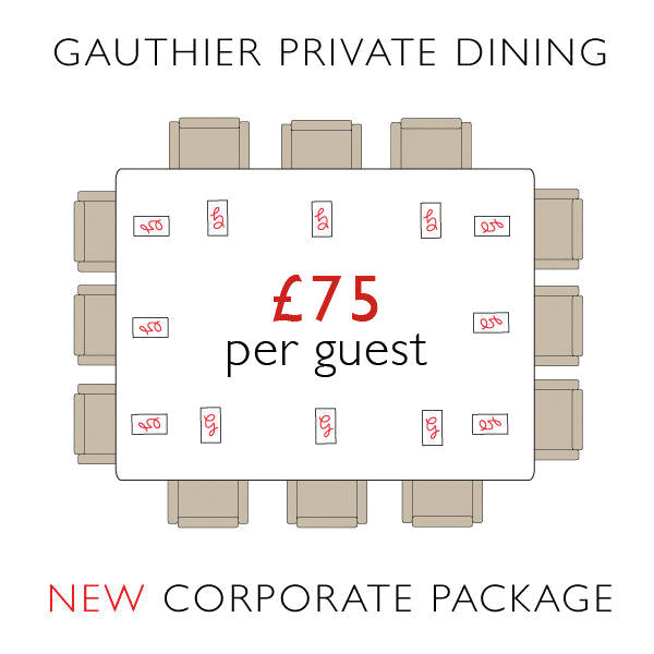 Thinking of bringing your team out for lunch or dinner? We've prepared a super package to simplify the process. Available from Tuesday to Thursday every week, Lunch & Dinner, a fixed price £75 for three courses (choosing on the day), a glass of Champagne, Half a bottle of wine, tea/coffee & petits fours, and all the other little extras you've come to expect at Gauthier Soho.